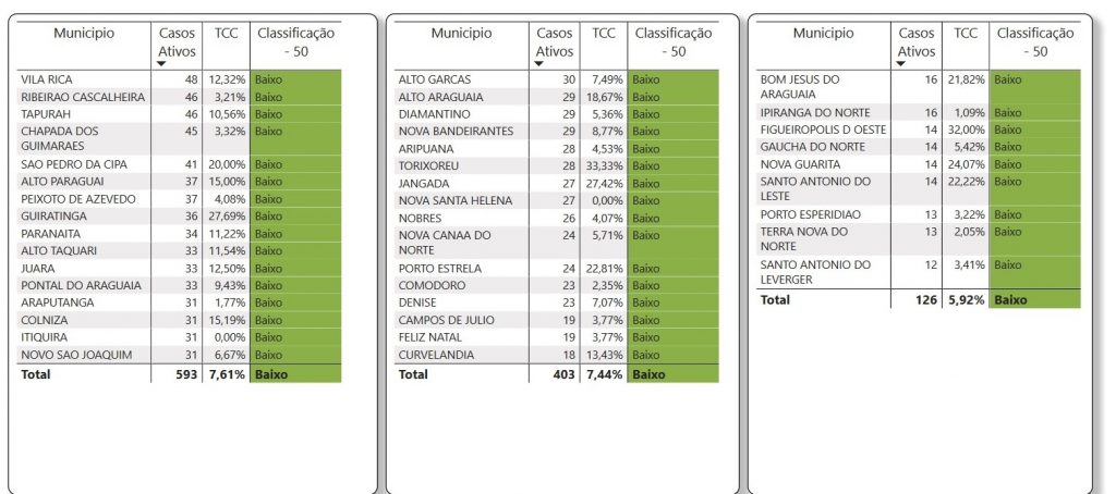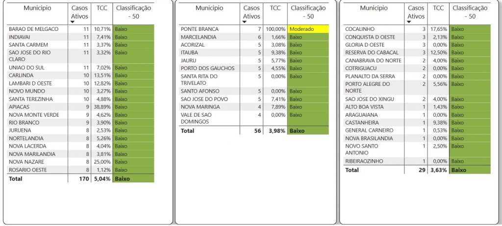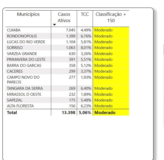 O documento mostra que 17 municípios estão classificados com risco moderado para o novo coronavírus são: Cuiabá, Rondonópolis, Lucas do Rio Verde, Sorriso, Várzea Grande, Primavera do Leste, Barra do Garças, Cáceres, Campo Novo do Parecis, Tangará da Serra, Mirassol D’ Oeste, Sapezal, Alta Floreta, Cláudia, São Felix do Araguaia, Vera e Ponte Branca.
