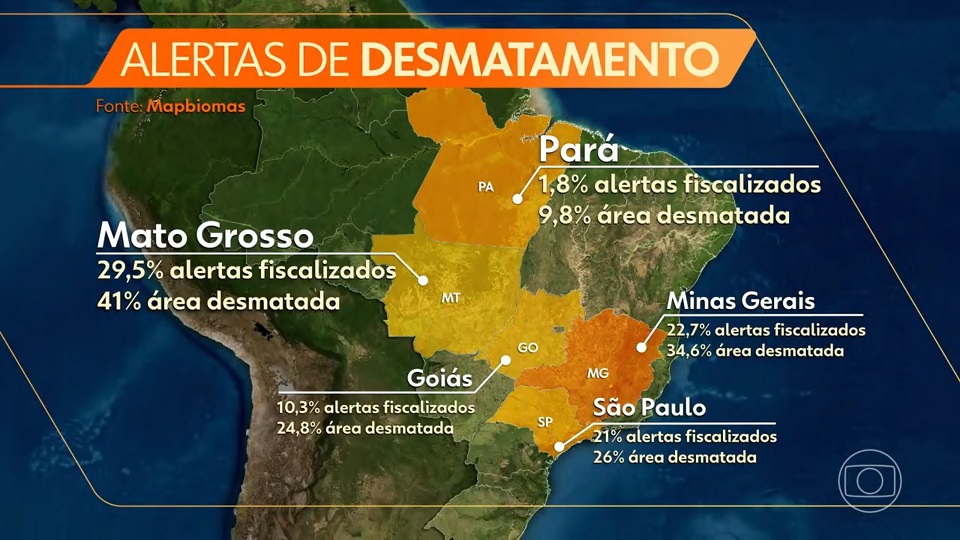 Mato Grosso é o Estado que mais realizou fiscalizações de áreas desmatadas através de alertas emitidos por satélite, conforme destacou a reportagem do Jornal Bom Dia Brasil, da Rede Globo, nesta quarta-feira (04.05). Os dados são do Monitor da Fiscalização do Desmatamento do Mapbiomas, que cruza alertas de desmatamento com embargos de áreas e licenças emitidas por órgãos ambientais.