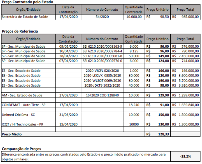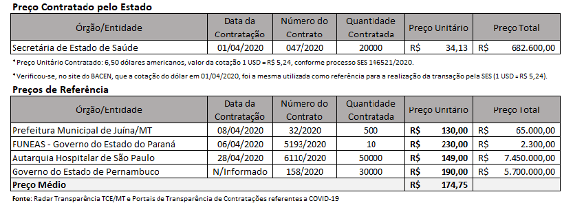 Para efeito de comparação, o preço médio unitário das aquisições de testes rápidos feitas pela Prefeitura do Estado de São Paulo, pelo Governo do Estado do Espírito Santo e pelas Prefeituras Municipais de Cáceres (MT) e Rondonópolis (MT) foi de R$ 110,00, diferença a menor de 69% entre o preço contratado pelo Estado de Mato Grosso e o contratado pelos estados e municípios analisados.