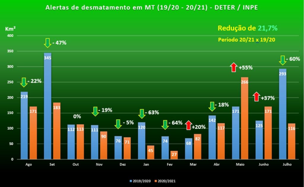 Com o intenso trabalho de fiscalização ambiental realizado pela Operação Amazônia, Mato Grosso reduziu em 60% os alertas de desmatamento no mês de julho em comparação com o mesmo período do ano passado. O dado oficial é do Sistema de Detecção do Desmatamento em Tempo Real (DETER) do Instituto Nacional de Pesquisas Espaciais (INPE).