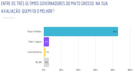 Mendes lidera com ampla vantagem, sendo apontado como o melhor gestor por 86% dos entrevistados. Em seguida aparecem o ex-governador Pedro Taques, com 6%, e Silval Barbosa, com 2%.