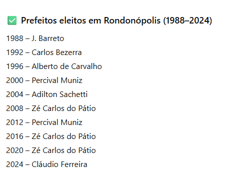 Mais recentemente, em 2024, Cláudio Ferreira também saiu da Assembleia Legislativa e foi eleito prefeito, tornando-se o quarto deputado estadual a vencer uma eleição municipal direta em Rondonópolis. Na mesma disputa, Thiago Silva, também deputado estadual, acabou derrotado.