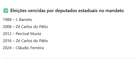 O histórico de vitórias de deputados rumo ao comando do Executivo municipal começou em 1988, quando J. Barreto, então deputado estadual, venceu nas urnas o deputado federal Percival Muniz. Barreto foi o primeiro caso de um parlamentar estadual deixar a Assembleia Legislativa rumo ao Palácio da Cidadania.