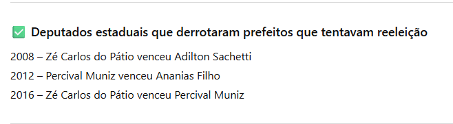 Em resumo, todos os prefeitos que tentaram a reeleição contra deputados estaduais foram derrotados.