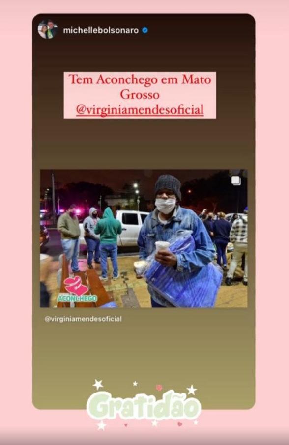 A entrega dos cobertores do Programa Aconchego pela primeira-dama de Mato Grosso, Virginia Mendes, foi destaque nas redes sociais da primeira-dama do Brasil, Michelle Bolsonaro. Nesta semana, que a capital do Estado sofreu as noites mais frias do ano, Virginia fez questão de entregar 300 cobertores a moradores de rua de Cuiabá.
