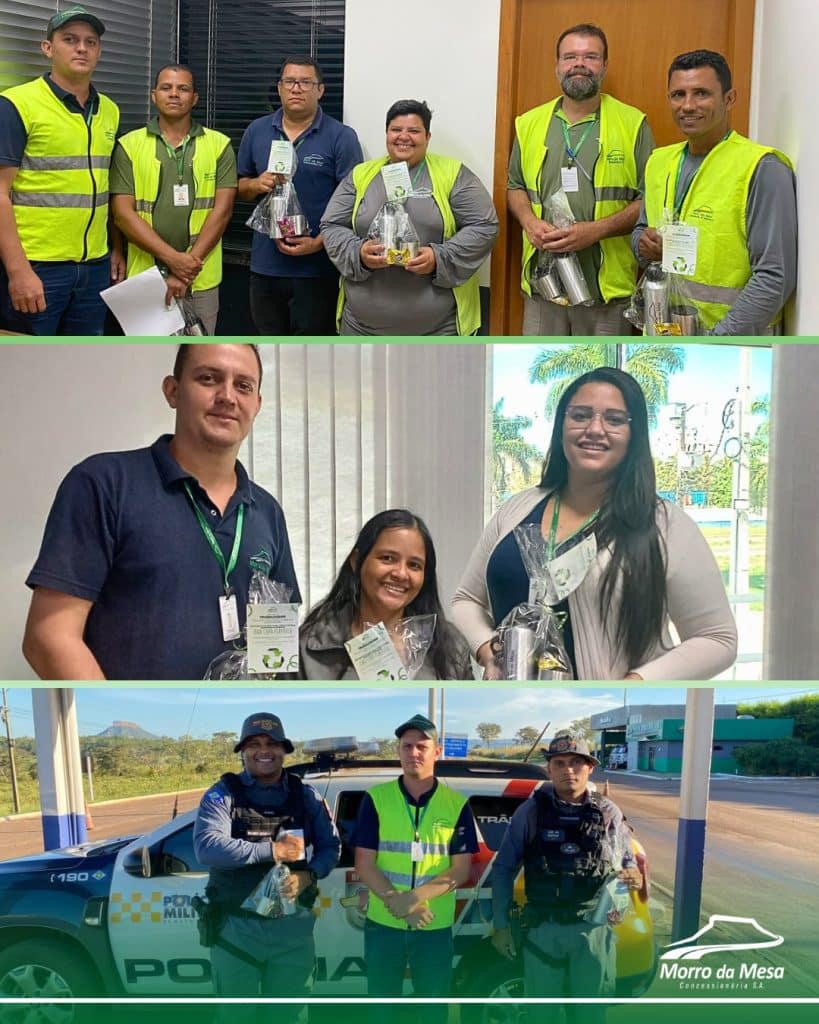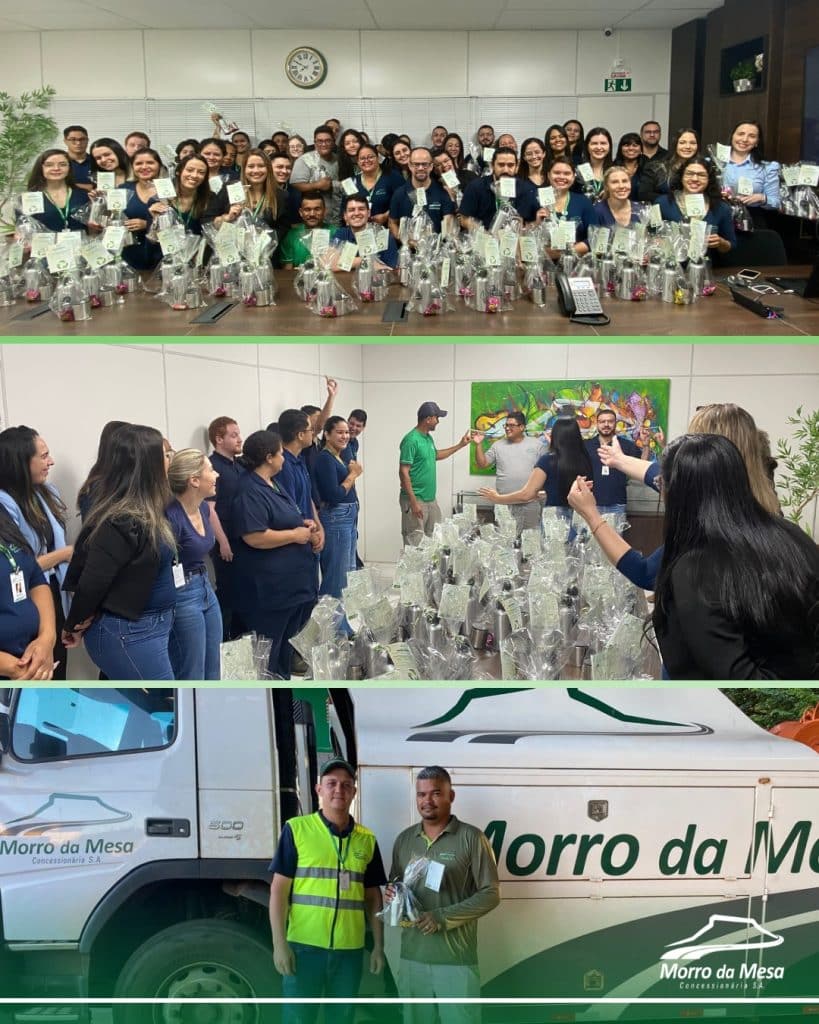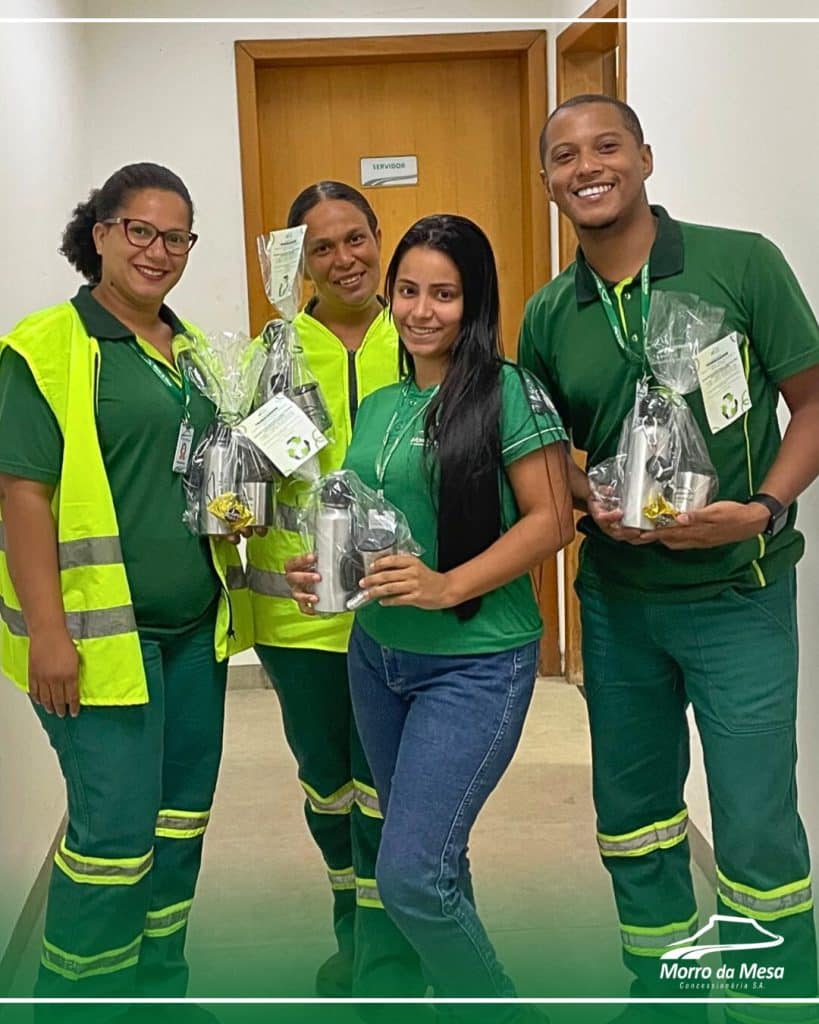 Todos os colaboradores receberam um kit personalizado, contendo uma garrafa reutilizável e um copo, incentivando o uso consciente e responsável dos recursos dentro e fora da empresa.