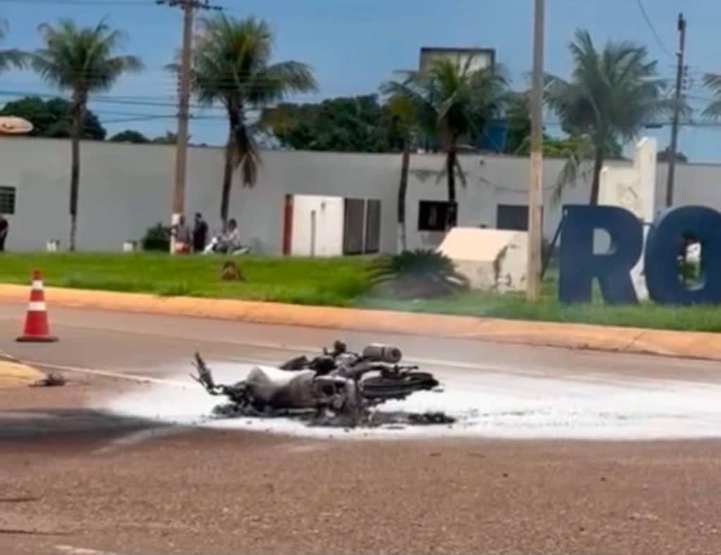 Uma motocicleta pegou fogo após uma colisão registrada na tarde de ontem (05), no Jardim das Flores, em Rondonópolis. O acidente foi registrado na rotatória do Anel Viário e envolveu a motocicleta e um carro de passeio.