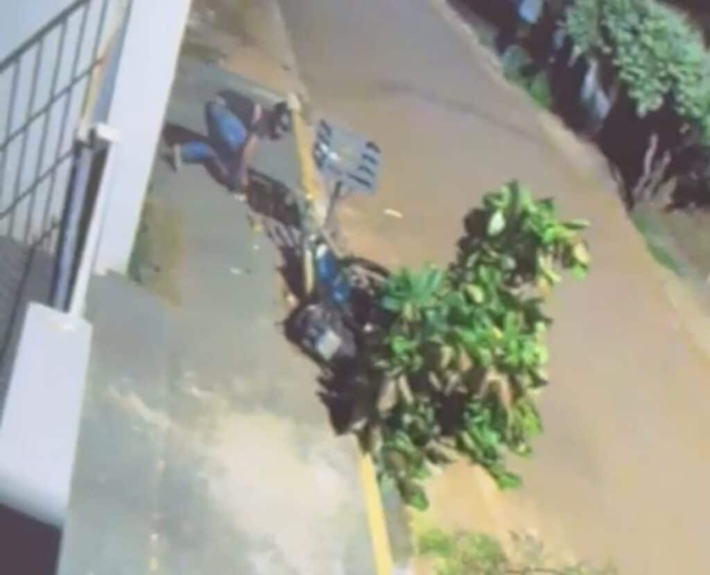 Câmeras de segurança de uma residência registraram o momento exato em que o condutor perde o controle da motocicleta, invade a calçada e arranca a árvore. Apesar do susto, o motociclista se levantou rapidamente, recolheu a moto e deixou o local. Ele não foi identificado.