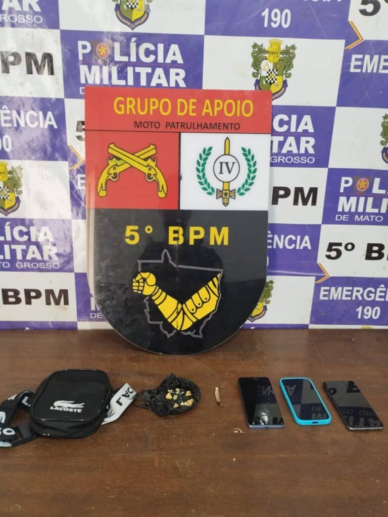 Após buscas sem sucesso pelos homens, os policiais retomaram as rondas na região e encontraram novamente a suspeita, desta vez na Rua Rosa Bororo, em frente a uma tabacaria. Durante a revista, foram encontradas nove porções de substância análoga à pasta base de cocaína, uma ponta de cigarro aparentando ser maconha e três celulares dentro de uma bolsa preta da marca Lacoste.