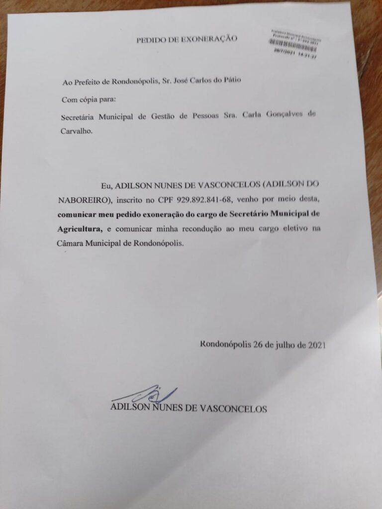 O secretário de Agricultura do município, Adilson Nunes de Vasconcelos, o Adilson do Naboreiro, protocolou no começo da tarde de hoje, o seu pedido de exoneração do comando da agricultura do município e, com isso, vai retornar à Câmara de Vereadores, na vaga do médico Manoel da Silva Neto (SD), que era seu suplente no Legislativo.