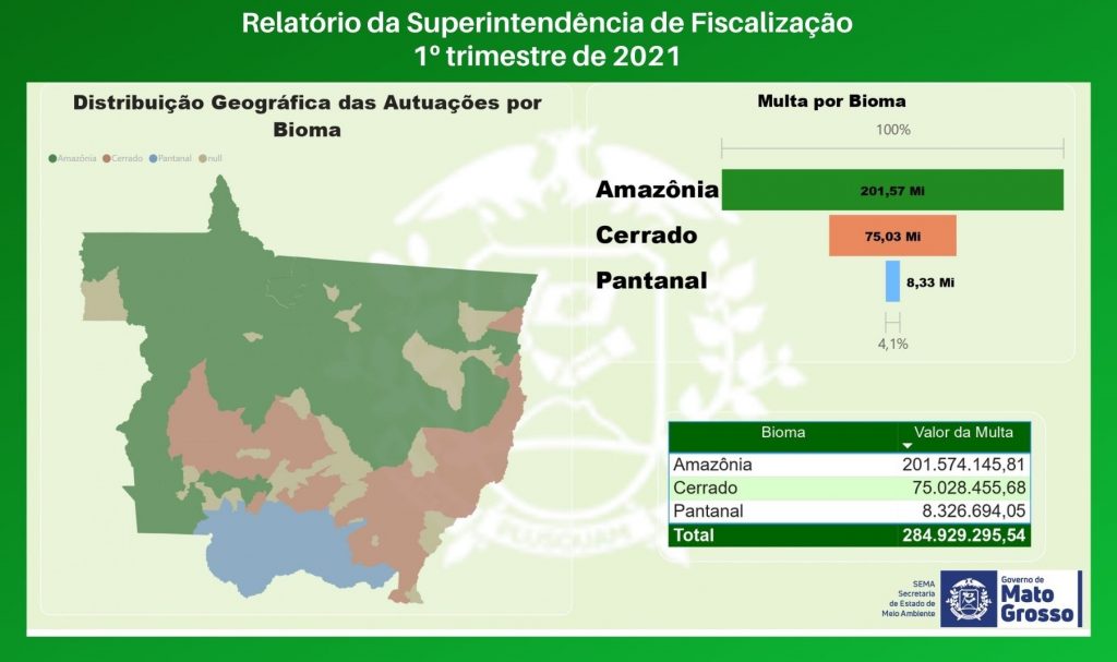 A maioria das multas incide sobre o Bioma Amazônia (R$ 201 milhões), em seguida o Cerrado (R$ 75 milhões) e Pantanal (R$ 8 milhões). As multas são aplicadas por desmatamento ilegal, descumprimento de embargo, instalação ou construção de empreendimento sem licença ambiental, comércio irregular de madeira, e outros crimes contra a flora.