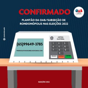No domingo (02/10/22), a OAB/Subseção de Rondonópolis irá redobrar a atenção em relação às prerrogativas dos profissionais que irão trabalhar no dia das eleições. Por intermédio da Comissão de Defesa das Prerrogativas, haverá um acompanhamento de perto sobre a atuação e respeito às prerrogativas profissionais, nas 04 (quatro) comarcas que compõem a Subseção: Rondonópolis, Itiquira, Pedra Preta e Guiratinga.