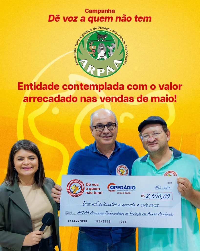A Operário Materiais de Construção deu prosseguimento a mais uma etapa da campanha “Dê voz a quem não tem”, que tem como objetivo principal garantir recursos a Organizações Não Governamentais (ONGs) de Rondonópolis voltadas para o atendimento da causa animal.