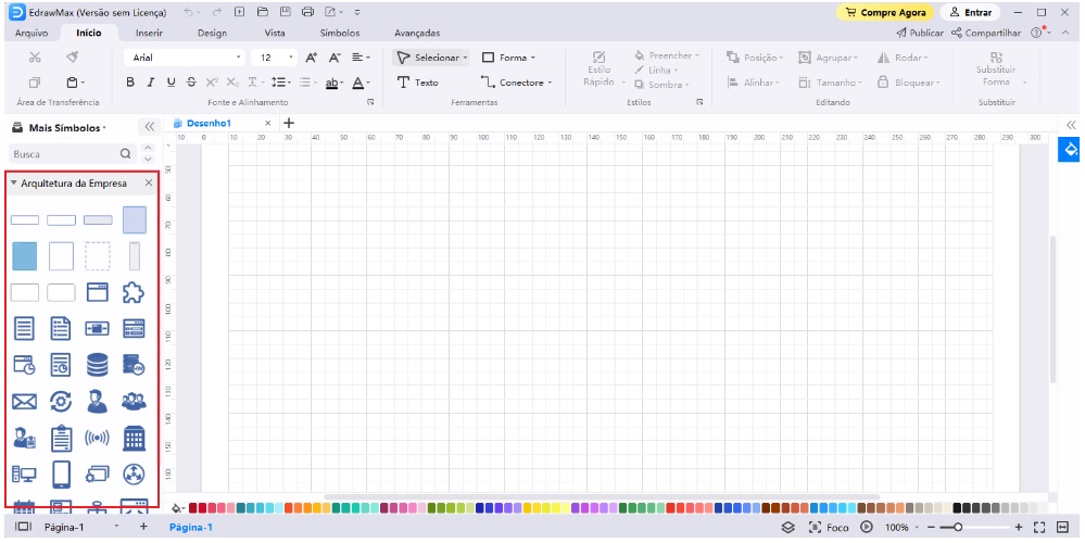 É uma poderosa plataforma de fluxogramas, que possui muitos recursos focados em colaboração, como documentos compartilhados e quadros brancos. Estes últimos têm os elementos integrados para permitir que você construa diagramas de fluxograma com um simples arrastar e soltar. Há duas maneiras de começar a trabalhar em seu fluxograma. A primeira é começar a pegar elementos e conectores da barra esquerda para construir seu processo do zero. A segunda é navegar pelos modelos disponíveis para você ao clicar no ícone da varinha mágica.