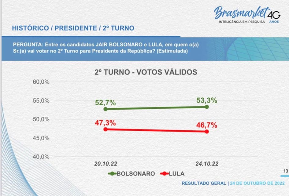 O Instituto Brasmarket informou que ouviu 2.400 pessoas de 529 cidades, por telefone, entre os dias 19 e 23 de outubro de 2022. A margem de erro da pesquisa é de dois pontos percentuais e foi registrada no Tribunal Superior Eleitoral (TSE) sob o número BR-08487/2022.