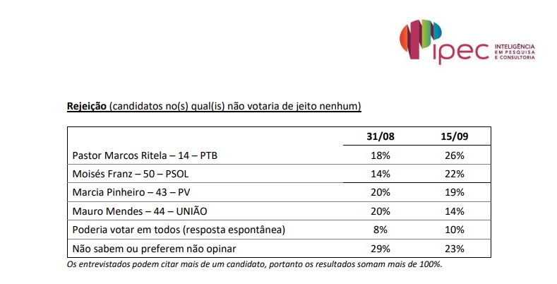 De acordo com pesquisa do Instituto Ipec/TV Globo, divulgada na última semana, o candidato à reeleição acumula apenas 14% de rejeição, contra 26% do Pastor Marcos Ritela (PTB), 22% de Moisés Franz (PSOL) e 19% de Márcia Pinheiro (PV). Dos entrevistados, 10% responderam que poderiam votar em qualquer um dos nomes e 23% não sabem ou não responderam.
