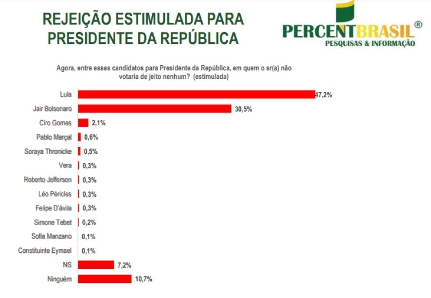 Em terceiro aparece o candidato Ciro com 2,1% de rejeição. Soraya Thronicke, Vera, Roberto Jefferson, Léo Péricles, Felipe D’ávila, Simone Tebet, Sofia Manzano e Eymael também aparecem com menos de 1% de rejeição.