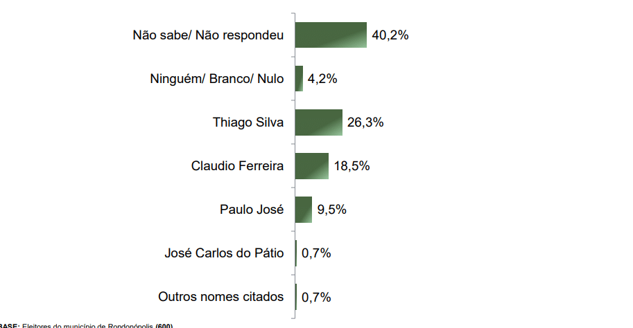 Os números para a pesquisa espontânea, onde o eleitor fala de forma direta o nome do candidato da sua preferência mostra o deputado estadual Thiago Silva (MDB) liderando com 26,3%, seguido de Cláudio Ferreira (PL) com 18,5% e Paulo José Correia (PSB) com 9,5%.