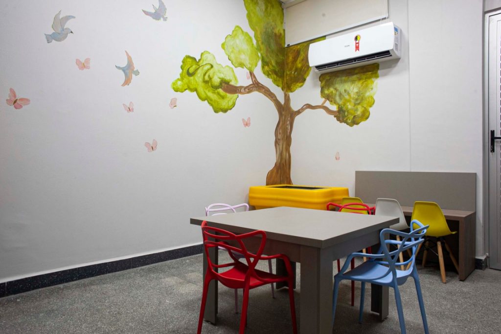 O Plantão da Mulher 24h tem salas apropriadas para acolhimento das vítimas, cartórios, salas de atendimento para as equipes policiais e psicossociais, além de uma brinquedoteca e playground para crianças.