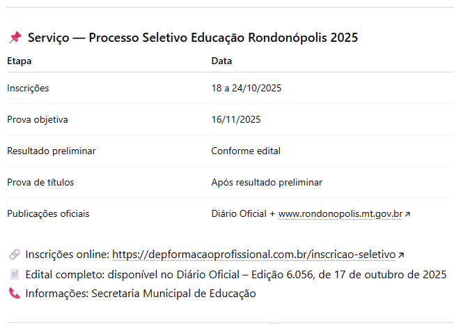 A Prefeitura de Rondonópolis abriu inscrições para o Processo Seletivo Simplificado (PSS) nº 002/2025 para contratação temporária de profissionais para a rede municipal de ensino. O edital foi publicado no Diário Oficial do Município e as inscrições são gratuitas e exclusivamente online estão abertas desde o dia 18 indo até 24 de outubro de 2025