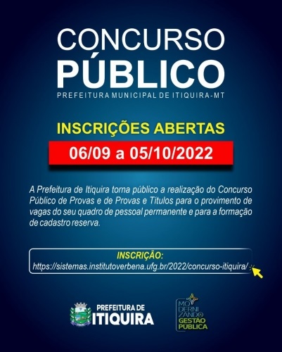 A Prefeitura de Itiquira publicou, edital de Nº 069/2022 para realização de concurso público para provimento de vagas do quadro de pessoal permanente e para a formação de cadastro reserva.