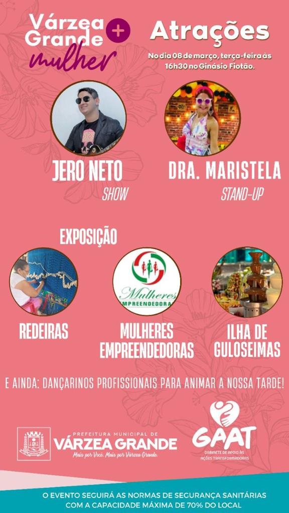 O público presente vai poder conferir a exposição de artesanato das redeiras, de  variados produtos confeccionados pelas “Mulheres Empreendedoras” e apreciar a ilha de guloseimas. Haverá também shows musicais e apresentação de dançarinos para animar a festa.  A ação faz parte do programa Várzea Grande + Mulher, que terá durante todo mês de março, uma vasta programação, com workshops realizados em quatro regiões da cidade.