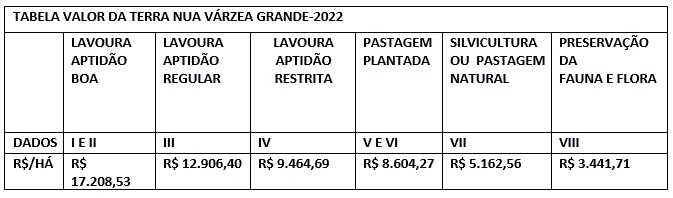 Para fins de atualização do Sistema de Preços de Terras (SIPT) da Receita Federal, seguem os valores da terra nua por hectare do Município de Várzea Grande/MT e passíveis de retificação pelo contribuinte sem a imposição de penalidade e inclusão na Malha Fiscal do ITR exercícios de 2021 e 2022, conforme tabelas abaixo:
