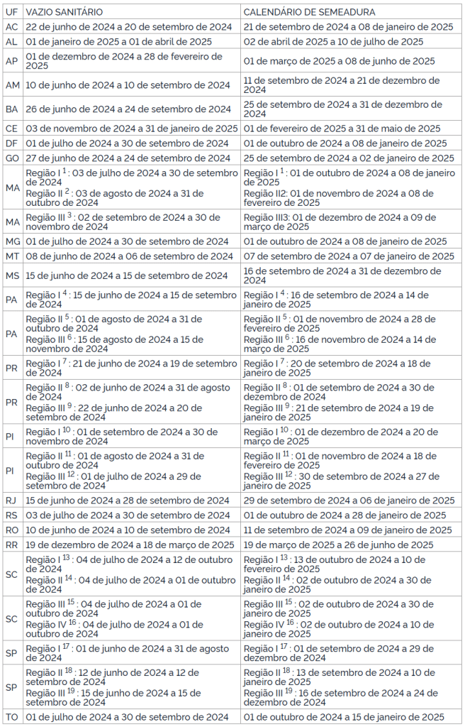 Para a definição das datas, o Mapa considerou as condições climáticas, bem como as sugestões encaminhadas pelos estados. “Para o estabelecimento dos períodos de vazio sanitário e do calendário de semeadura, utilizamos de dados técnicos, além de realizar reuniões com os órgãos estaduais defesa vegetal de forma individual e regional, analisando de forma conjunta, todas as propostas enviadas pelas unidades da federação”, explica a diretora do Departamento de Sanidade Vegetal e Insumos Agrícolas, Edilene Cambraia.