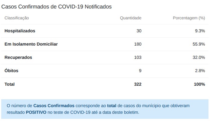 Vale destacar que há 180 pessoas contaminadas pela Covid-19 que estão em isolamento domiciliar, ontem este número era de 167. Os números mostram ainda 30 pessoas com o vírus hospitalizadas e 103 já recuperadas e com alta hospitalar, o número de óbitos permanece em nove.