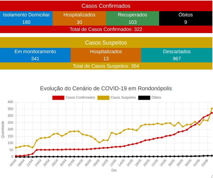 No entanto, o total de casos em Rondonópolis saltou de 304 na quarta-feira (3) para 322 no dia hoje.