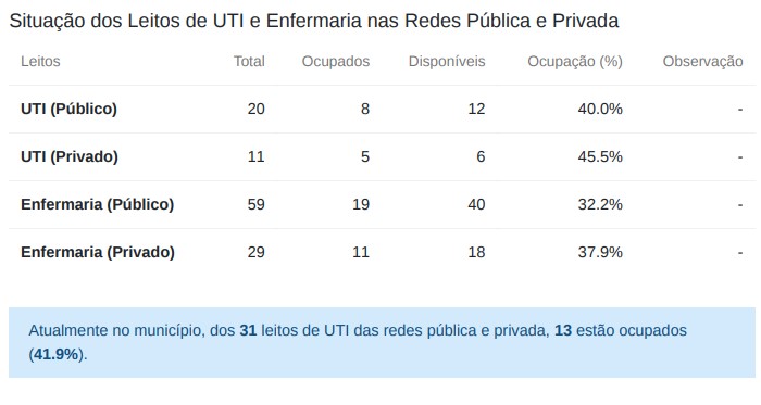 A taxa de ocupação de UTIs, de acordo com o boletim da secretaria de Saúde é de 41,9%, dos 31 leitos disponíveis 13 estão ocupados. Ontem essa taxa era de 38,7% com 12 leitos ocupados.