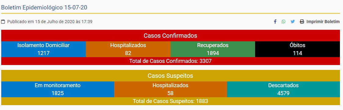 A informação é total de casos chegou a 3307, ontem o volume de casos era de 3195, o que mostra um crescimento de 112 casos em 24 horas, número superior a ontem e anteontem quando o total de novos casos foram de 83 e 89 respectivamente.