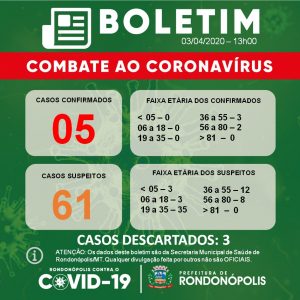 A cidade de Rondonópolis, de acordo com dados fornecidos pelo Gabinete de Comunicação Social do município, conta com 61 casos suspeitos de Coronavírus e com cinco confirmados.