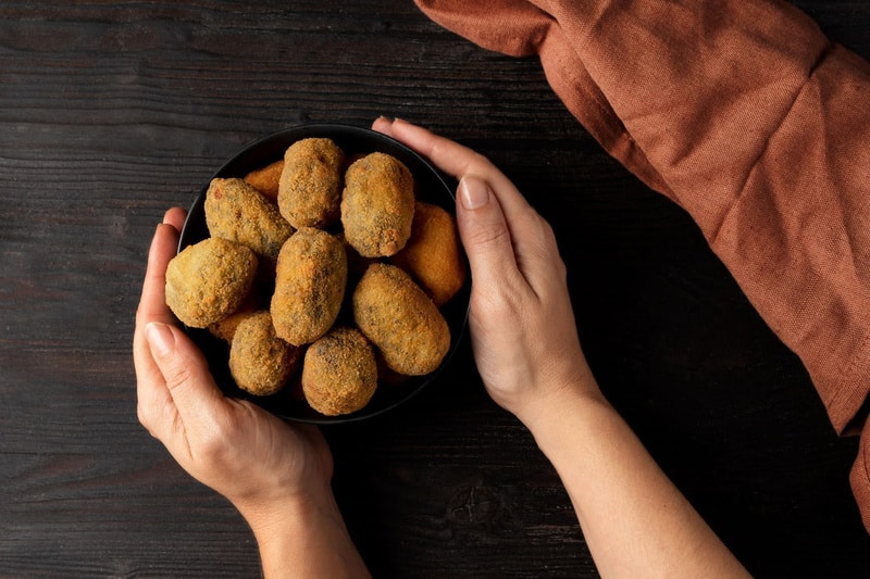 Modo de preparo: frite a carne na panela com azeite e refogue com a cebola, alho, sal e pimenta do reino. Coloque o vinho e deixe o álcool evaporar. Em seguida, acrescente o extrato de tomate e o caldo de carne. Tampe a panela e deixe a carne cozinhar até ficar bem macia. Quando estiver secando o caldo, ponha a salsa. Dissolva a farinha de trigo no leite e leve à carne. Cozinhe até ganhar uma massa consistente. Reserve. Depois molde os croquetes e empane no ovo batido e, posteriormente, na batata palha. Agora frite na frigideira (ou na airfryer, se preferir) até dourar.