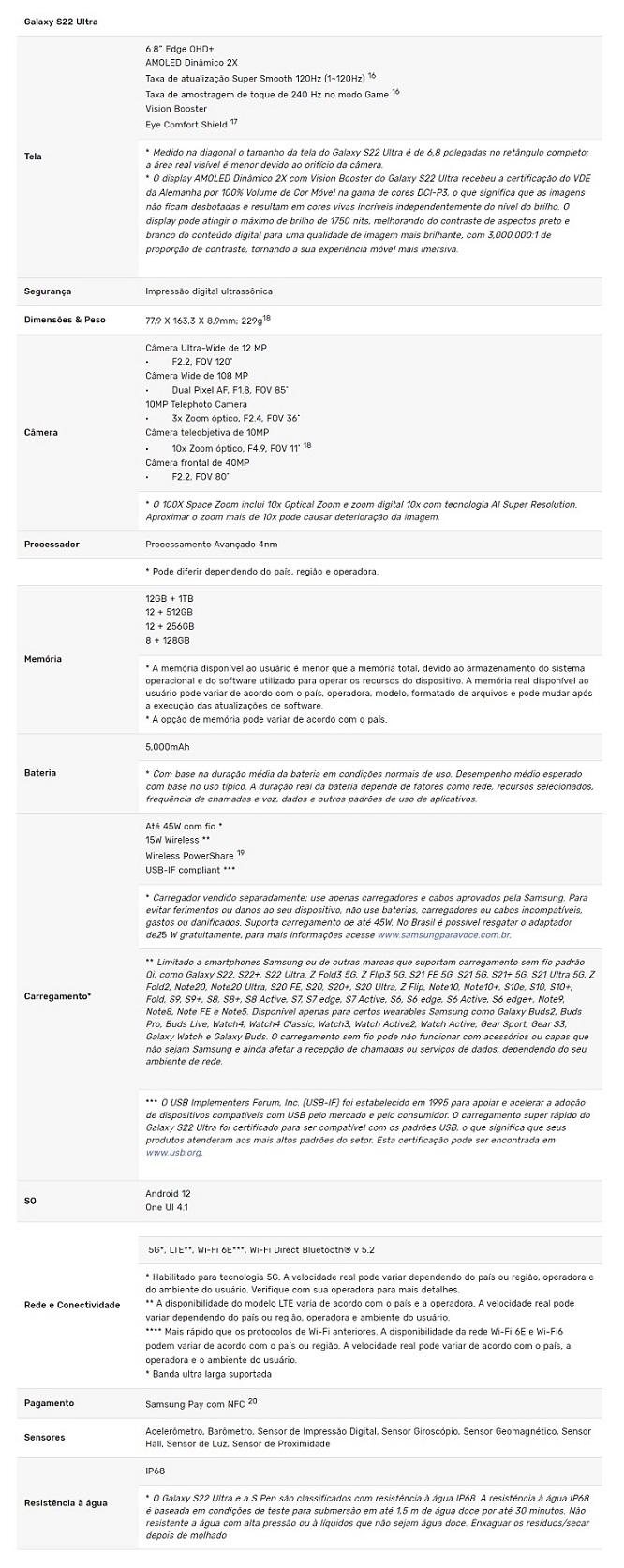 ● Galaxy S22 Ultra: Preto, Branco, Verde e Vinho em modelos de 128 GB, 256 GB, 512 GB e 1 TB com 8 GB e 12 GB de RAM