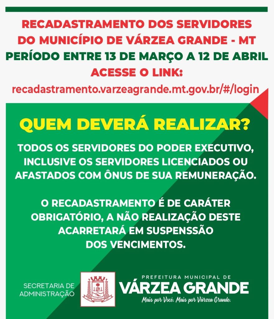 Atendendo o entendimento do prefeito Kalil Baracat de que o maior patrimônio da Prefeitura de Várzea Grande são seus servidores e, portanto, sua vida funcional e carreira devem ser movimentadas no intuito de prestar um serviço público de qualidade a população e a cidade, a Secretaria de Administração, realizará no período de 13 de março a 12 de abril deste ano, o recadastramento de todos os servidores efetivos, contratados e comissionados, em exercício, no âmbito da Administração Direta do município. O recadastramento é obrigatório e o próprio servidor será o responsável por efetuar seu recadastramento de forma digital, através do site da prefeitura (www.varzeagrande.mt.gov.br).