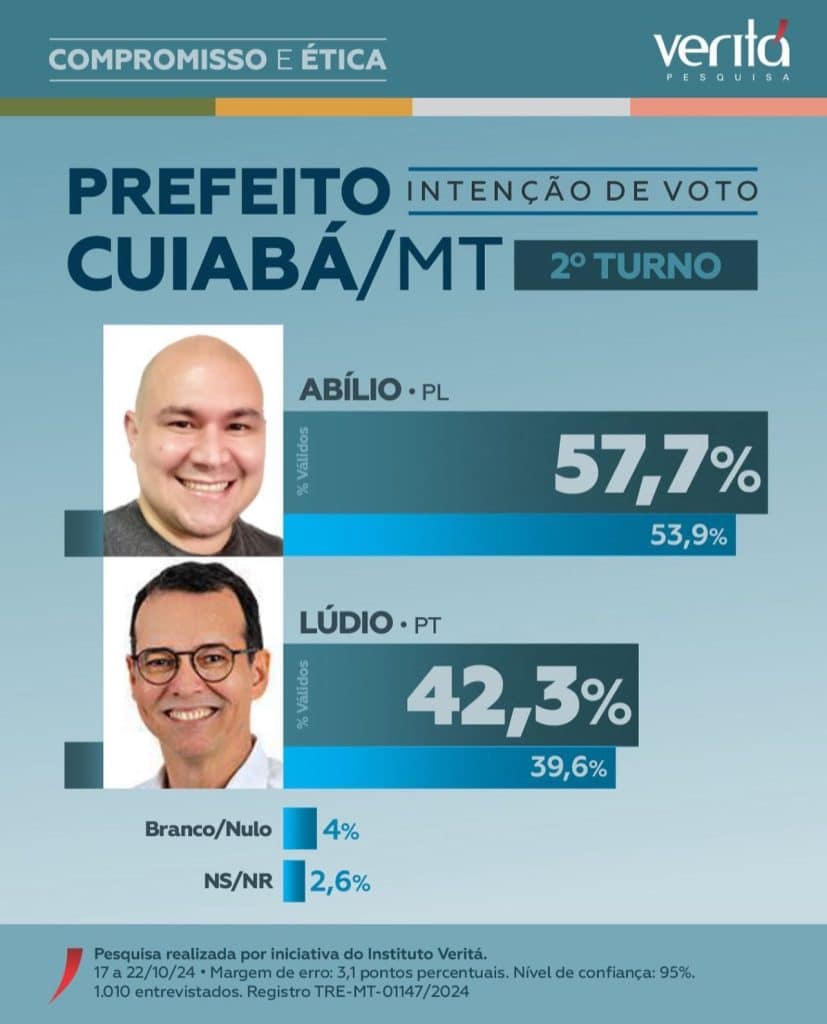 Pesquisa do Instituto Veritá, divulgada nesta quarta-feira (23), aponta o candidato Abilio Brunini (PL) disparado na liderança do segundo turno, com 57,7% das intenções de voto. O petista Lúdio Cabral aparece com 42,3%.