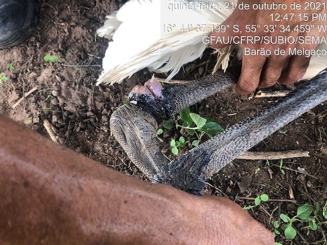 Agentes da Secretaria de Estado de Meio Ambiente (Sema-MT) atenderam um tuiuiú (Jabiru mycteria) ferido por linha de pesca, na última quinta-feira (21.10), em Barão de Melgaço (135 km de Cuiabá). O animal foi tratado e devolvido à natureza, e segue em observação. A conduta adotada foi a de menor intervenção possível para evitar o estresse do animal.
