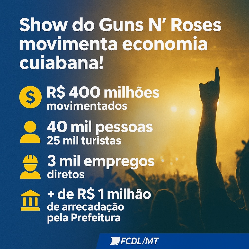 Conforme dados levantados pela Federação das Câmaras de Dirigentes Lojistas de Mato Grosso (FCDL/MT), o show da banda Guns N’ Roses, realizado em Cuiabá, deve gerar um impacto econômico expressivo na capital e em toda a cadeia do comércio e serviços locais.