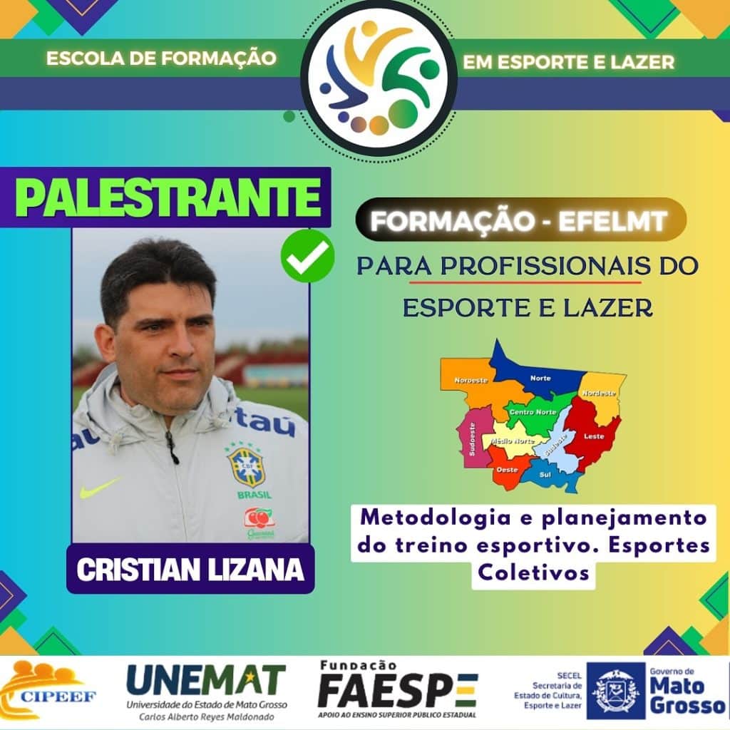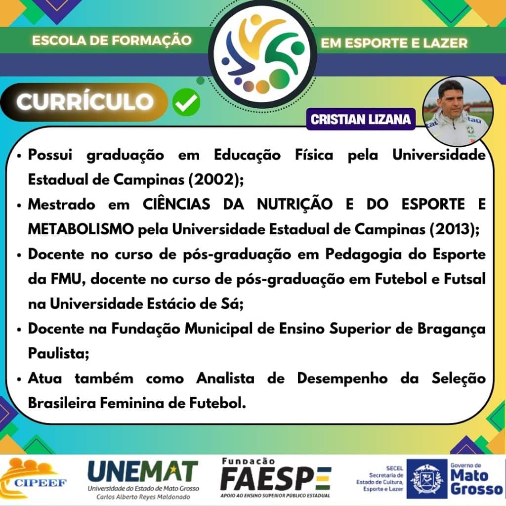- Esportes Coletivos: Ministrado pelo Professor Cristian Lizana, doutorando em Ciência do Esporte e atual Analista de Desempenho da Seleção Brasileira Feminina de Futebol, medalhista de prata em Paris 2024. O Professor Lizana trará sua vasta experiência no futebol para abordar a metodologia aplicada em esportes coletivos. Sua palestra será realizada no CEFORME – Centro de Formação Continuada da Rede Municipal de Ensino.