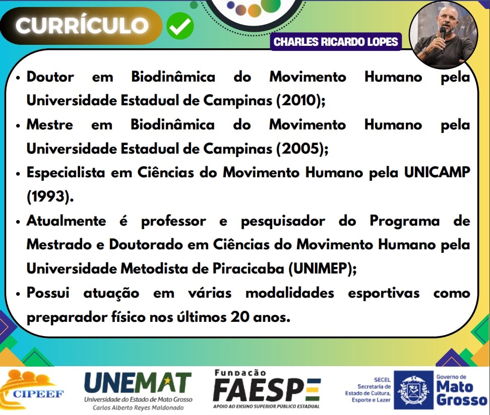 - Esportes Individuais: Conduzido pelo Professor Charles Ricardo Lopes, doutor em Biodinâmica do Movimento Humano pela Universidade Estadual de Campinas e renomado autor na área de treinamento esportivo. O Professor Lopes tratará das particularidades do planejamento para esportes como atletismo, lutas e natação. Sua apresentação ocorrerá na Escola EMEB – Rodrigo Damasceno.