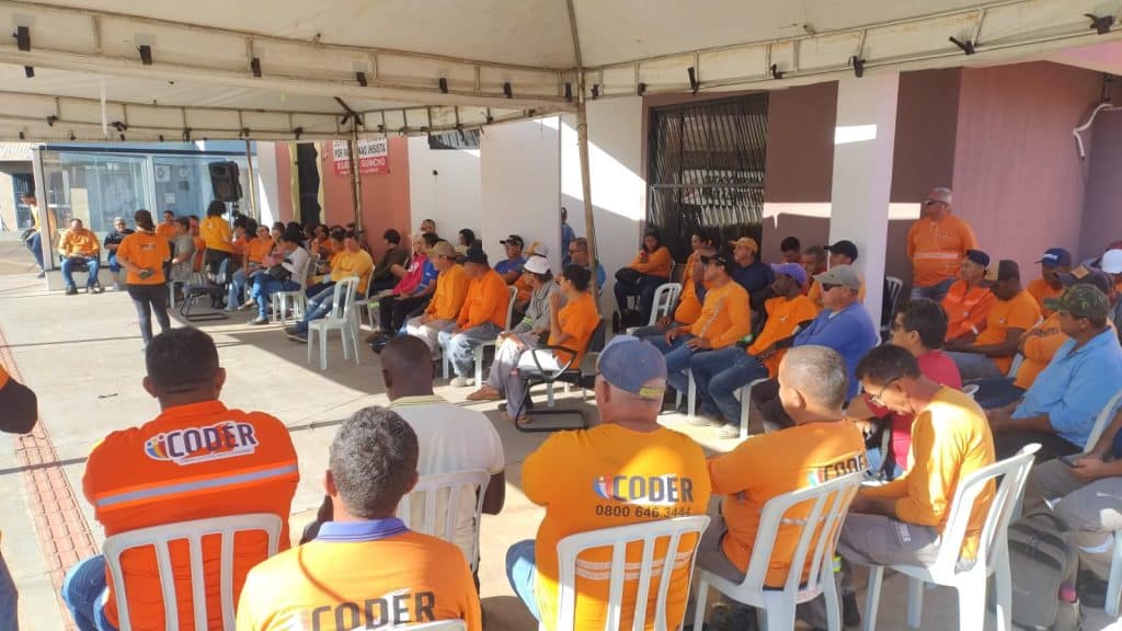 Servidores da Coder, conhecidos como “Coderianos”, estão reunidos no local com faixas e cartazes em apoio à permanência da empresa.
