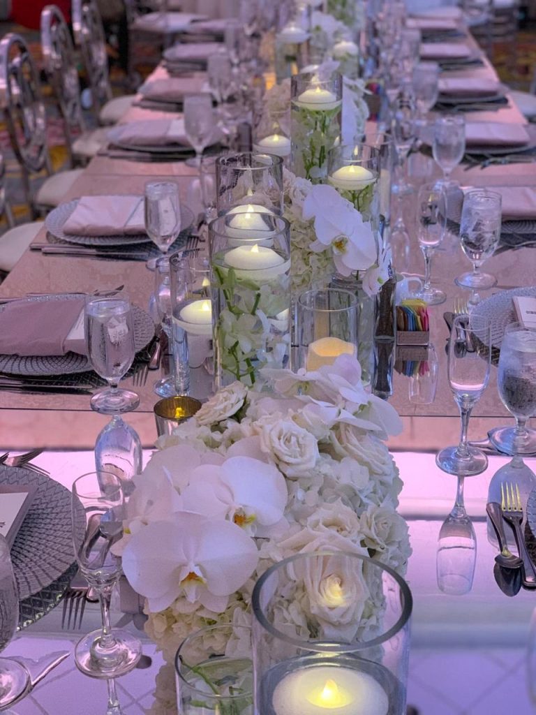 Para a decoração, a noiva estava bem definida e optou por aliar a magia Disney à tradição brasileira: “tive uma mesa de doces linda, mesa de bem casados, muito prateado, espelhado e o transparente. Fazia questão de uma pista de dança branca com o nosso monograma espelhado. Queria um palco com um painel de led e conseguimos a mesma estrutura que o Alok usou no show dele por lá. Na pista de dança tinha um lustre de flores e ficou maravilhoso”.