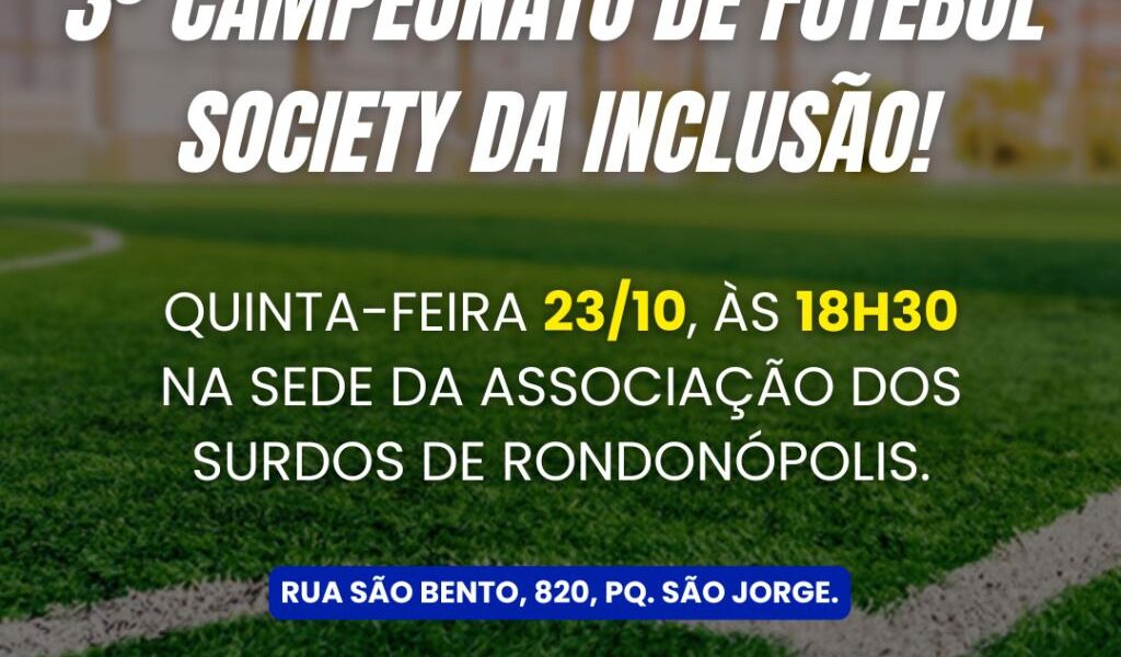 O esporte e a inclusão social estarão em campo nesta quinta-feira (23), a partir das 18h30, com o início do 3º Campeonato de Futebol Society da Inclusão, promovido pela Associação dos Surdos de Rondonópolis (ASSUROO). O evento será realizado na sede da entidade, localizada na Rua São Bento, nº 820, no bairro Parque São Jorge, […]