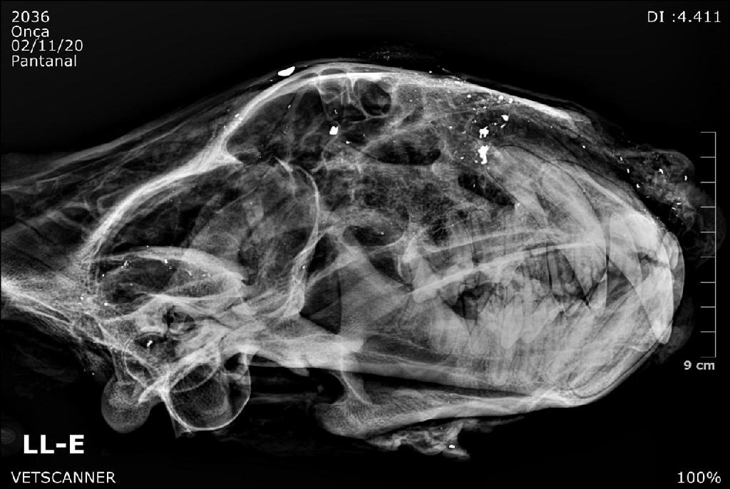 Imagem radiológica mostra bala estilhaçada em crânio de onça-pintada – Foto por: VetScanner