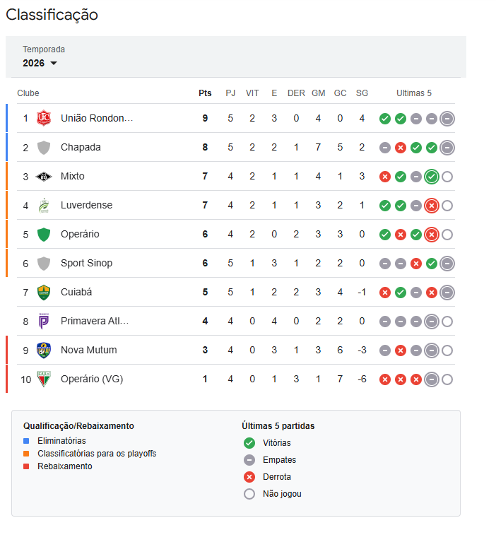 O time rondonopolitano, no entanto, terá a chance de reagir já nesta terça-feira (27), quando enfrenta o Cuiabá, fora de casa. A equipe da capital vem de um empate em 2 a 2 com o Chapada e faz campanha irregular na competição.