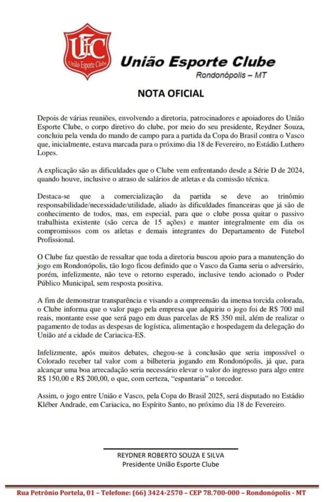 A assessoria de imprensa do União Esporte Clube anunciou na tarde terça-feira (11), a venda do mando de campo da partida contra o Vasco da Gama, que inicialmente seria realizada no estádio Luthero Lopes, em Rondonópolis. O jogo da Copa do Brasil, agora acontecerá em Cariacica, no Espírito Santo, por decisão de uma empresa que adquiriu os direitos.
