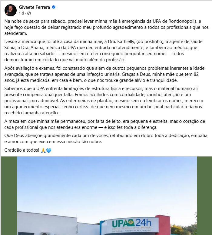 “Sabemos que a UPA enfrenta limitações de estrutura física e recursos, mas o material humano ali presente compensa qualquer falta. Fomos acolhidos com cordialidade, carinho, atenção e um profissionalismo admirável. As enfermeiras de plantão, mesmo sem eu lembrar os nomes, merecem um agradecimento especial. Tenho certeza de que nem mesmo em um hospital particular teríamos recebido tamanha atenção”, disse Giavete, agradecendo a todos os profissionais que participaram do atendimento desde o início, como agentes de saúde, equipe do PSF, equipe da UPA, profissionais de enfermagem e médicos.