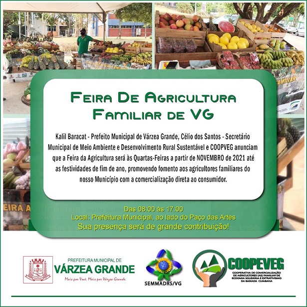 No fortalecimento da Agricultura Familiar de Várzea Grande, a Secretaria Municipal de Meio Ambiente e Desenvolvimento Rural Sustentável lança oficialmente a Feira da Agricultura do mês de novembro. A comercialização dos produtos segue até as festividades do final do ano de 2021. Os produtos orgânicos são oriundos diretamente das comunidades rurais de Várzea Grande que integram a cooperativa de comercialização COOPEVEG.