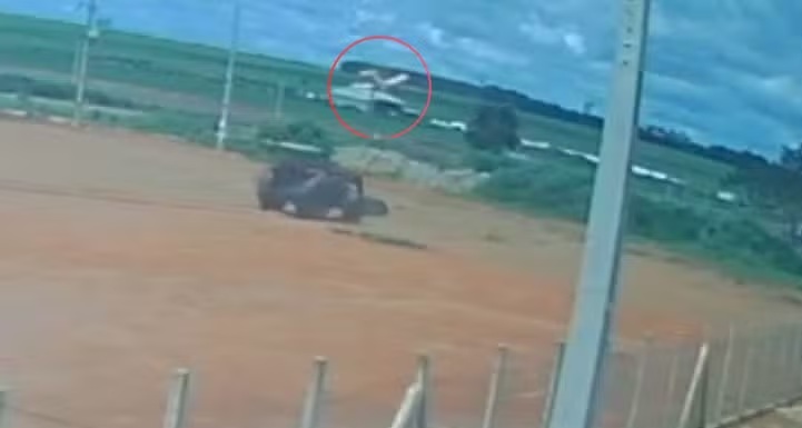 Imagens de câmeras de segurança mostram o momento em que um avião agrícola perde altitude e cai de bico no km 291 da BR-070, em Primavera do Leste, a 239 km de Cuiabá, nesta quarta-feira (11).